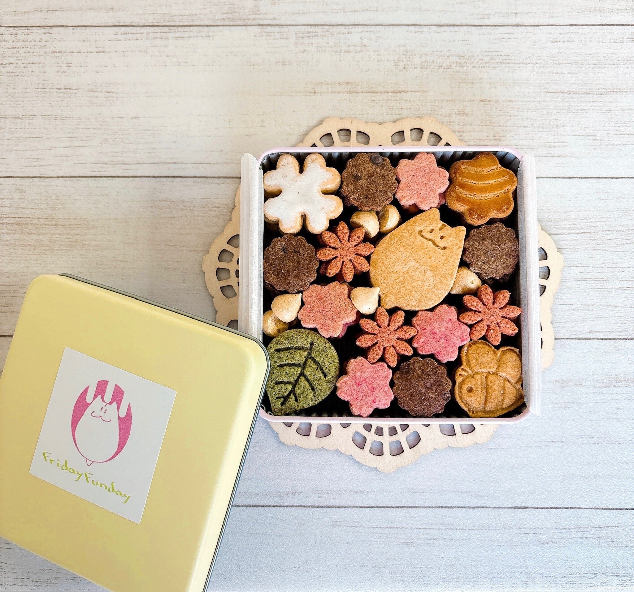 小麦粉(国内製造)、バター、グラニュー糖、粉糖(グラニュー糖、粉末水飴)、卵、アーモンド、チョコレート、カソナード、はちみつ、きな粉、桜パウダー、いちごパウダー、よもぎ、レモン、オレンジリキュール、ビーツパウダー、乾燥卵白、食塩/重曹、香料